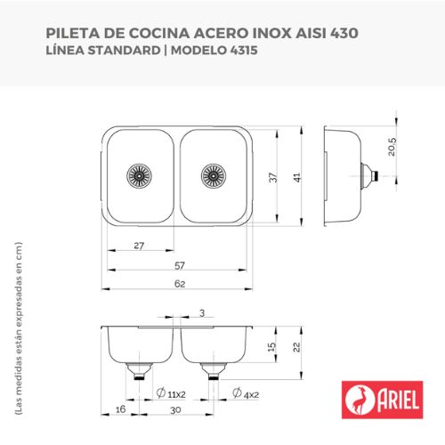 Bacha Doble Ariel 57 x 37 x 15cm 4315 Acero