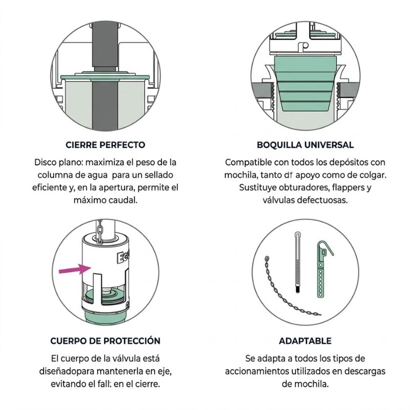 En mochilas con descarga tipo flapper, se instala en el orificio de descarga sin necesidad de desmontar todo el mecanismo.