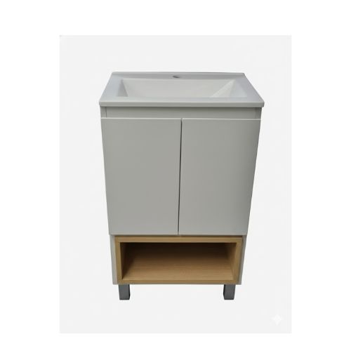 El Vanitory de Pie MH 50 cm Clásico con Bacha de Loza ofrece una solución práctica y resistente para baños pequeños y medianos. Su diseño tradicional asegura buena presencia y funcionalidad, mientras que la bacha de loza aporta durabilidad, brillo y fácil limpieza.